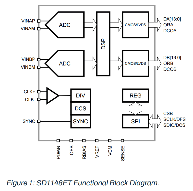 The SD1148ET is a dual-channel, 14-bit, analog-to-digital converter (ADC) supporting sampling rates up to 125MSps. The