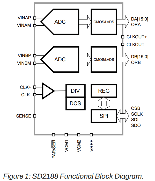 The SD2188 is the dual-channel, 16-bit, analog-to-digital converter (ADC) supporting sampling rates up to 20MSps. The