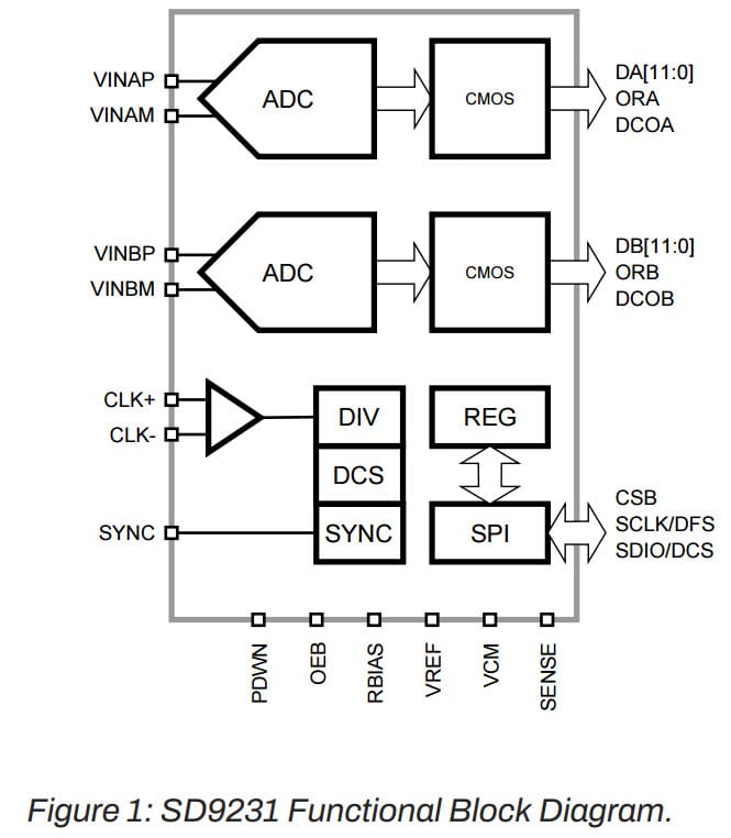 The SD9231 is a dual-channel, 12-bit, analog-to-digital converter (ADC) supporting sampling rates up to 20MSps. The