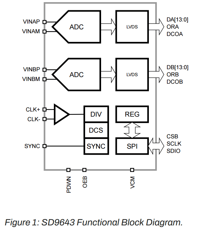 The SD9643 is a dual-channel, 14-bit, analog-to-digital converter (ADC) supporting sampling rates up to 170MSps. The