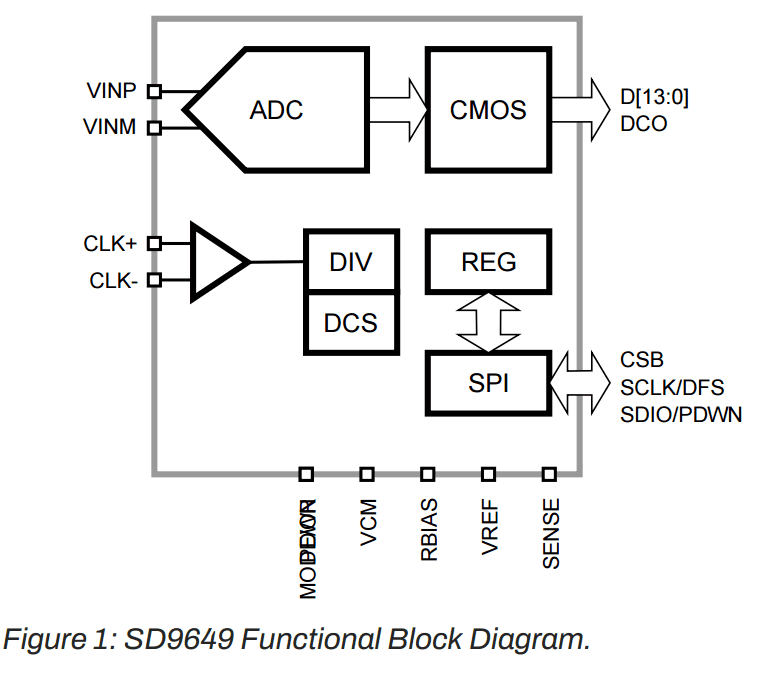 The SD9649 is a single-channel, 14-bit, analog-to-digital converter (ADC) supporting sampling rates up to 80MSps. The